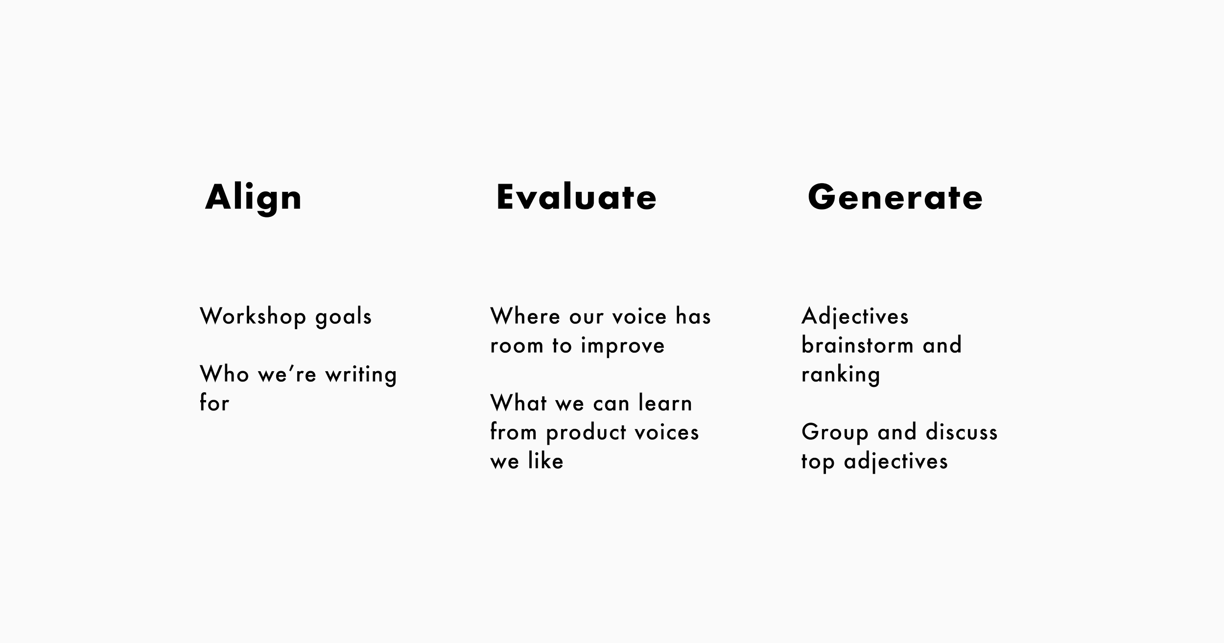 I showed example screens from brands like Slack and Dropbox, assigning adjectives to their respective voices, to demonstrate how it looks when a voice is deployed consistently. I showed examples of how our voice was a bit all over the place, mixing language that was excited, formal, down-to-earth, and cute.