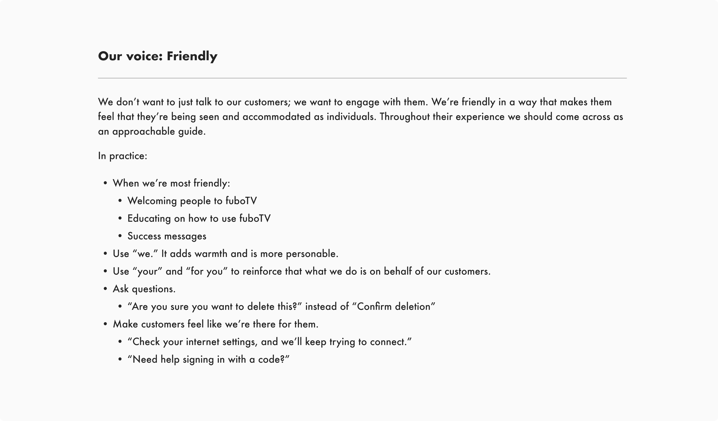 I was the first UX writer at fuboTV, a sports-forward streaming service. Early in my tenure, I determined writing principles, developed and conducted a workshop with stakeholders, and turned the results into documentation of our voice and tone that would become part of fubo's design system.