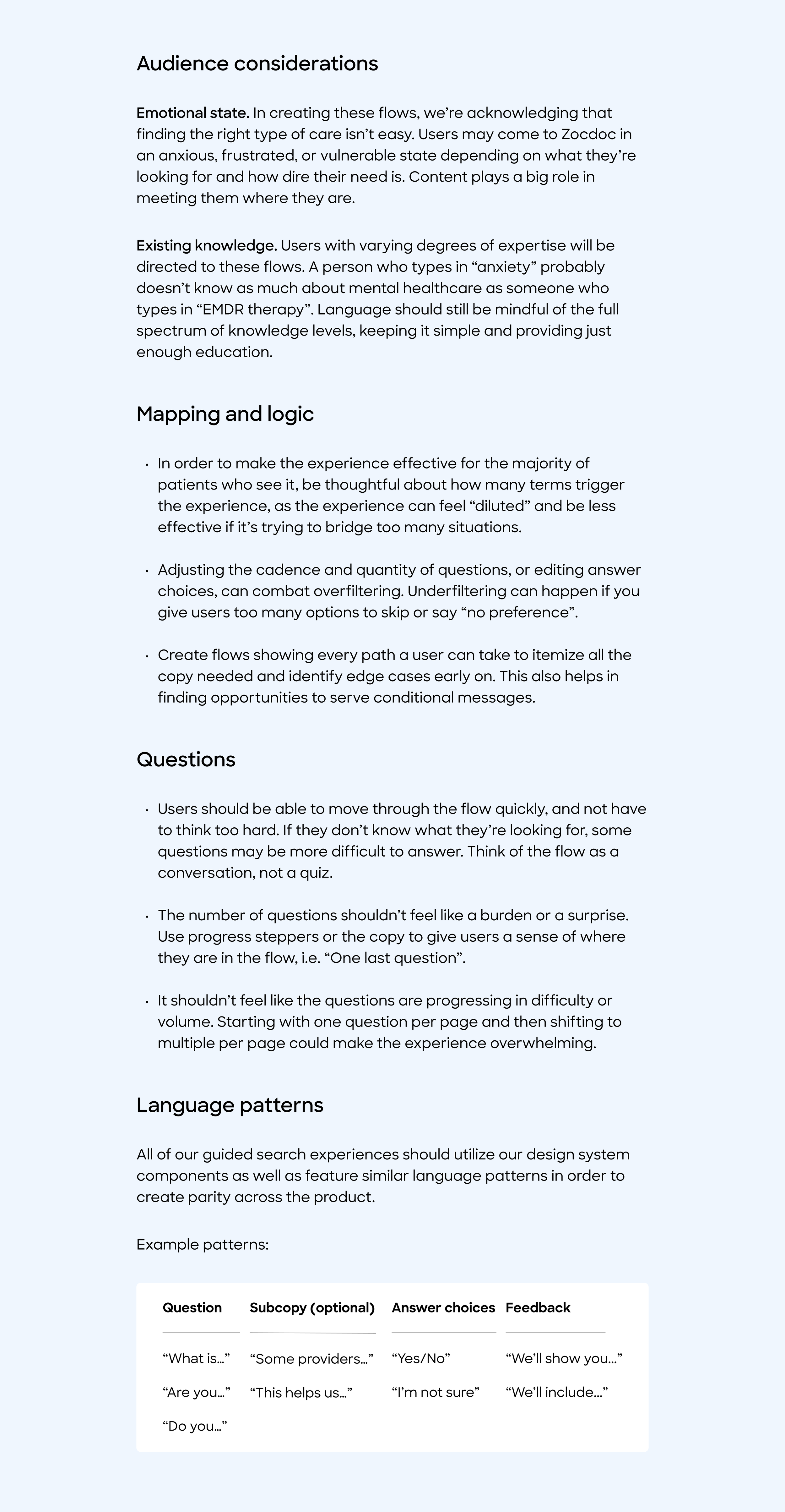 I developed an experience that guided users toward the right providers while collecting information for the doctor that could improve the visit. I also created and maintained guidelines on how to strategize and write content for guided search experiences.